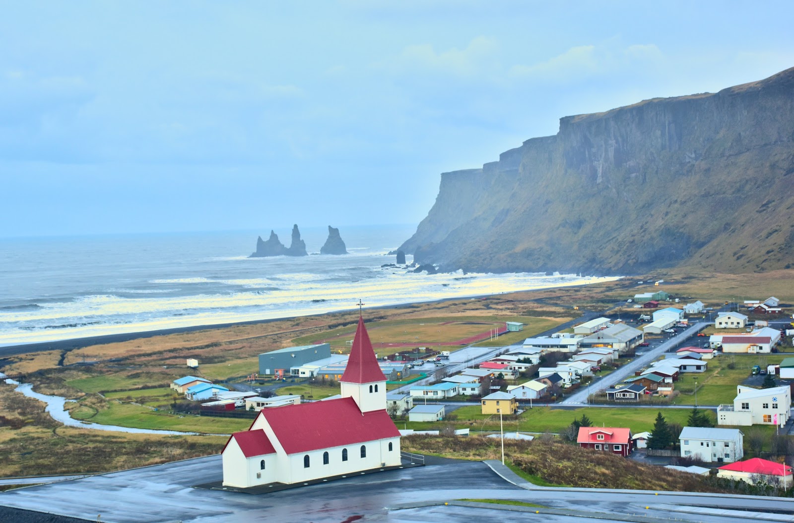 We then started driving towards east on the Ring Road and were contemplating a stop between Reynisfjara beach and Skógafoss Due to the bad weather we decided to visit Skógafoss and keep the beach for better weather. The distance wasn’t great and in under an hour we were at Skógafoss. The children refused to get out of the car this time and it was me who again went closer to the falls for some beautiful pictures. This was a much larger falls than Seljaandsfoss and the pictures don’t really do justice to it’s height. The sun appeared for a moment and I was lucky to see one rainbow on the falls. I’ve heard of three rainbows at times. Before I could try different angles on my camera the sun bid good bye. After rain chased me back to the car we drove further east and passed a mini parking by the road which we realised were the cars whose occupants were making a 3 km – 45 minute trip (one way) to a crashed DC 3 plane in the desert of Solheimsandur. That was never part of our itinerary and the desolate landscape only reaffirmed that! We then drove onto Vík church and the cemetery above it for a photo-op. This was the most photographed view in Vík. The lovely sweeping view from atop the hill covered the church, the tiny town of Vík, its beach and all the way out to the Reynisdrangar sea stacks in the Atlantic. Vík is the southern most point in Iceland and open to the north Atlantic Ocean. There is no land mass south of Vík all the way until Antartica. So that results in some dangerous waves in the Reynisfjara beach on the other side of the Reynisfjall mountain. Vík is also on the path of a potential glacier flood if Mt. Katla were to erupt. Mt. Katla is long due an eruption and is under the Mýrdalsjökull glacier. An eruption would melt the Mýrdalsjökull glacier and all the glacier melt would flow towards the ocean. The hill we were standing on is the only place that would be safe if that catastrophe were to happen. Thinking about this made me realise how insignificant man was in front of nature! I was hoping to catch a glimpse of the setting sun and take some nice pics from my vantage position but sadly the clouds played spoil sport. We returned to the Ring Road and continued our journey to Hörgsland Cottages, our stop for the night.