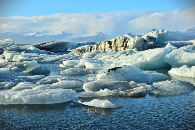 After stopping at several locations for marvelling at the vision in front of our eyes and for pictures, we reached Jökulsárlón at about 12 noon. It was the busiest sight we had seen in Iceland this far. A lot of cars, people, tour buses and activities abound! We found a parking spot and quickly rushed out to bitterly cold winds. It was a sunny and gorgeous day – only from the inside. Before our fingers froze we quickly put on our gloves and edged towards the lagoon. Sam was annoyed with the wind and wanted to return to the car again. Not once she picked up a chunk of glacial ice from the shore! There were ice of all shapes and sizes. There were quite a few chunks of ice glittering in the sunlight on the shore. The children picked up some and wanted to lick them! We walked along the edge of the lagoon watching some large icebergs break and fall into the lagoon with a big splitting noise. The currents jostled the icebergs and they were always on the move; towards the ocean. I worked on some pictures after the other three went to the cabin to warm themselves up.