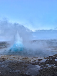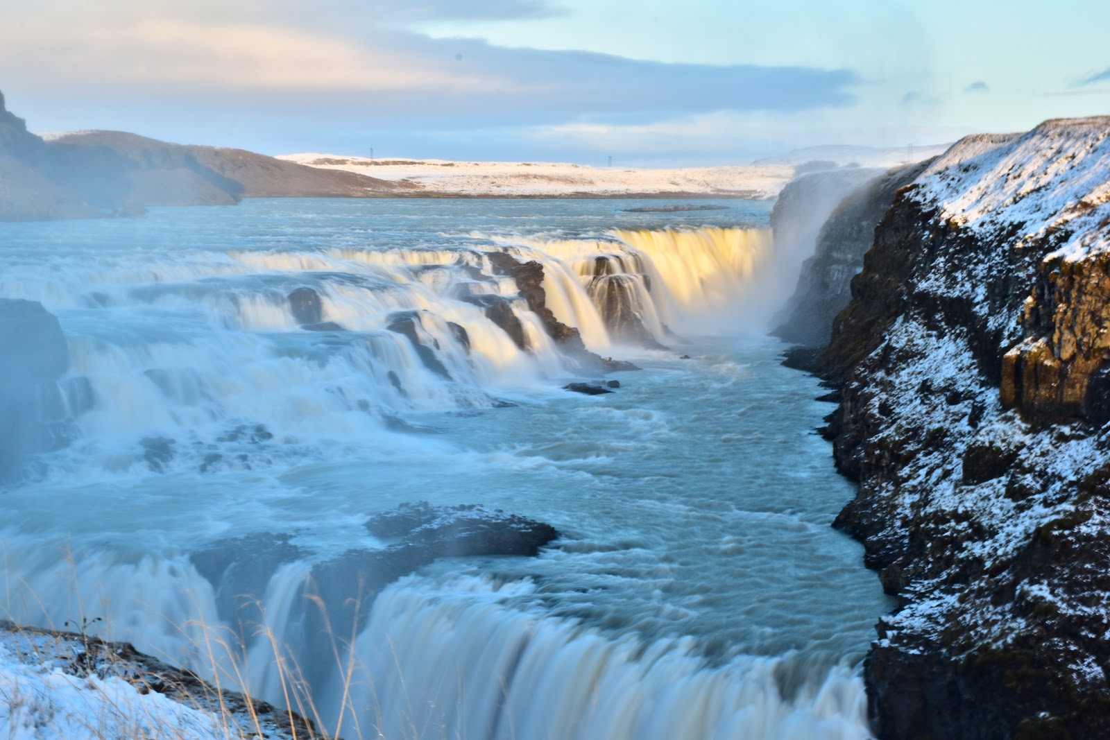 We stopped a couple of times to take pictures of Icelandic sheep and horses before we turned off the Ring Road to head towards the Golden Circle. The wool of Icelandic sheep is very different in that it can keep one both warm and cool as the temperature outside regulates. They are also waterproof in that they continue to provide warmth even if they become wet. A unique evolution for a sub-arctic climate indeed! We trusted the GPS to guide us to the Gullfoss. Little did we realise that it was giving us a circuitous route. We reached Gullfoss before sunset and got to walk on snow after a long time! The sun was shining directly on the waterfalls and it made a lovely sight. The Gullfoss was one of the widest waterfalls we had seen in a long time. Reminded us of the horseshoe falls of the Niagara. There were also more people here than the other waterfalls we had seen as it was very close to Reykjavik.