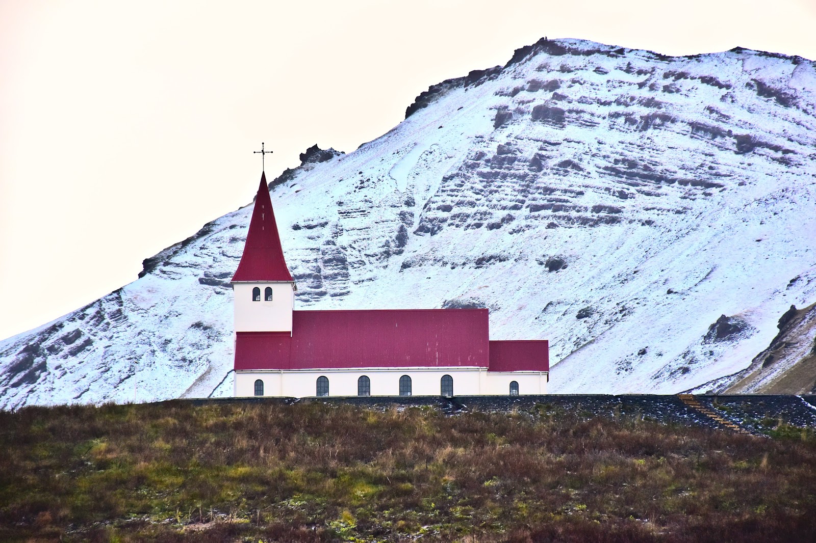 As we neared Vík we saw that it had snowed in these parts earlier and all the slopes were covered with snow. We stopped under the Vík church at a gas station to take a picture of the church from the other angle and with snow in the background.
