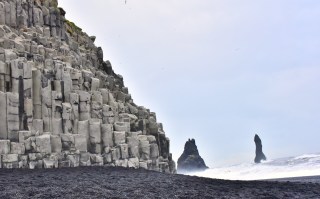 You’ll be unprepared for he first sight of the Reynisfjara beach even after seeing numerous pictures on the internet. It is like seeing a very colourful picture in black and white! It is a black sand beach like every other beach in Iceland. The biggest attention seeker here is the cave and the basalt columns stacked up like some one from the ocean had come in overnight and had transferred the contents of his freight ship which was forgotten to be picked up by its owner. The Reynisdrangar stacks in the ocean looked a little different than they looked from the hill top couple of days ago. There is a myth that trolls that tried to drag their ship to the shore became the stacks when the sun rose. This beach is known for monstrous waves and had resulted in a few deaths. Knowing this I stayed well away from the edge and was admiring the beauty and taking pictures when one wave chased me back even further! Watched a few people getting wet and shuddered at the thought of how it would feel on a day like this. There was already some ice on the sand and it started snowing then. Before I could call out to the others, it stopped! The children tried climbing on the stacks and then we made our way further west to spot the Dyrhólaey Arch and the lighthouse on top of an earlier island. The wind was blowing the foam and spray from the waves did not offer us a clear view. We decided it was enough and returned to the car. I had brought along a flask with hot water flavoured with a cardamom and clove and that provided a good respite from the cold. All of us took a few sips to warm ourselves.