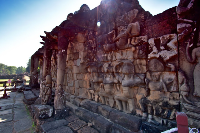 Arriving here in the mid-day sun, we weren’t too thrilled with the carvings here. We walked in the shade between the terraces and soon wanted to move on.The terraces are believed to receive victorious armies through the Victory Gate of Angkor Thom.