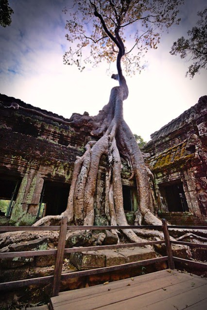 A huge tree growing out of the temple |