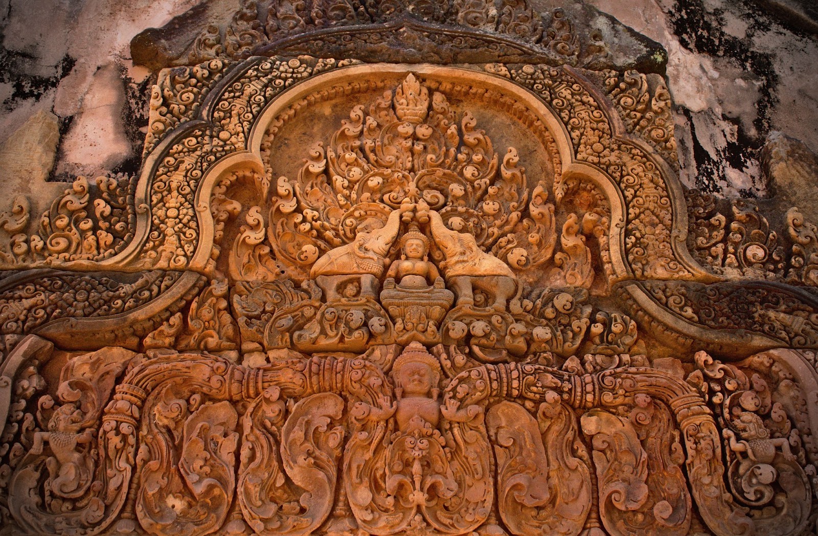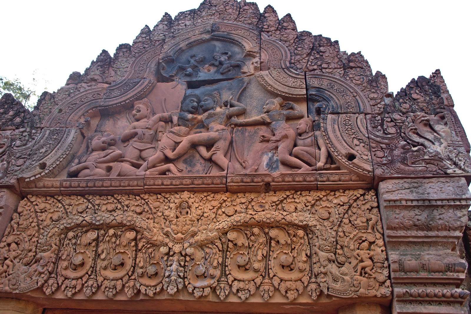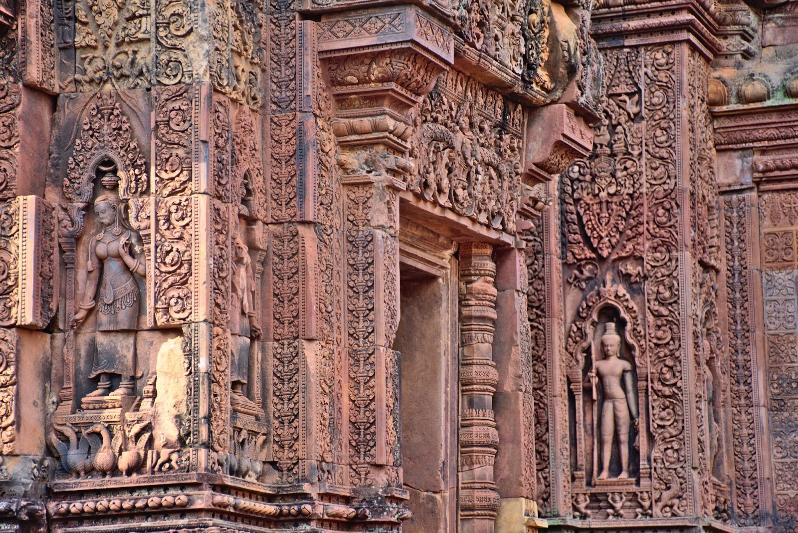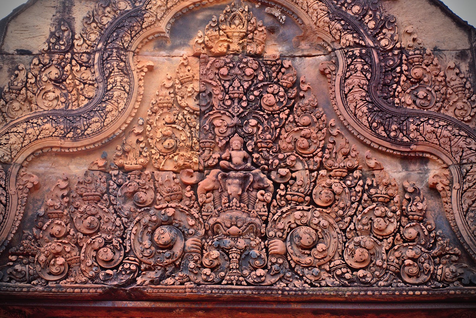 A small temple, quite tiny by Angkorian standards, that was built in the 10th century is the most charming of all temples. It’s made of laterite and pink sandstone. However the treatment of pink sandstone is what makes it different. Lovely carvings, so neatly etched as if it were wood, makes this temple a treasure to relish.
