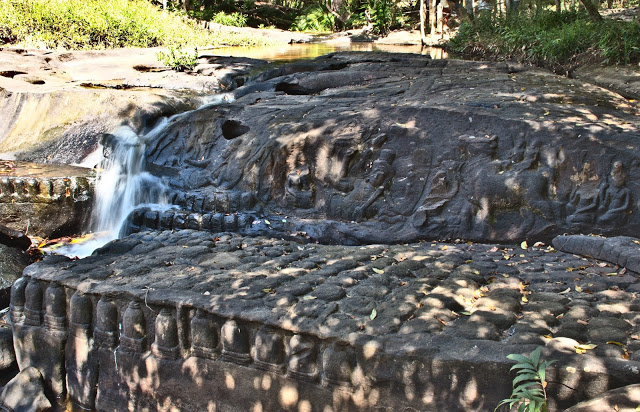 The falls at Kbal Spean with carvings of reclining Vishnu, Shiva & his consort on Nandi, the bull and the Lingas |