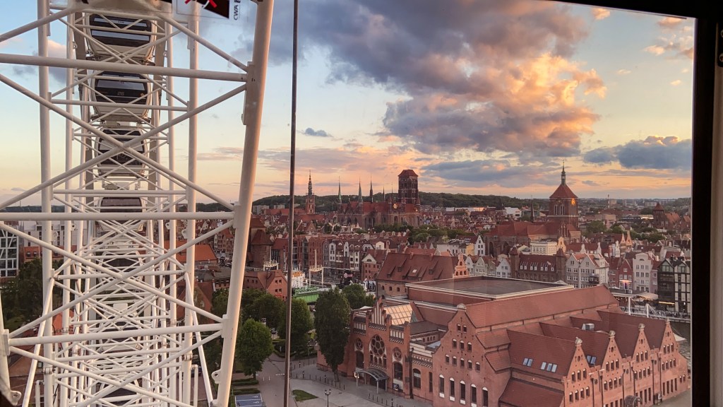 I have been wanting to go up on this ever since we planned to visit. The view of Gdańsk from above could either be captured with a drone, from one of the church towers or from the Amber Sky. We chose the easiest option. We walked through the Długa, crossed the Motława and its branches a couple of times before arriving at AmberSky. There wasn’t much of a queue and we were on in no time. With three rounds, each lasting a full 5 minutes, there was ample time to take pictures of Gdańsk at dusk.