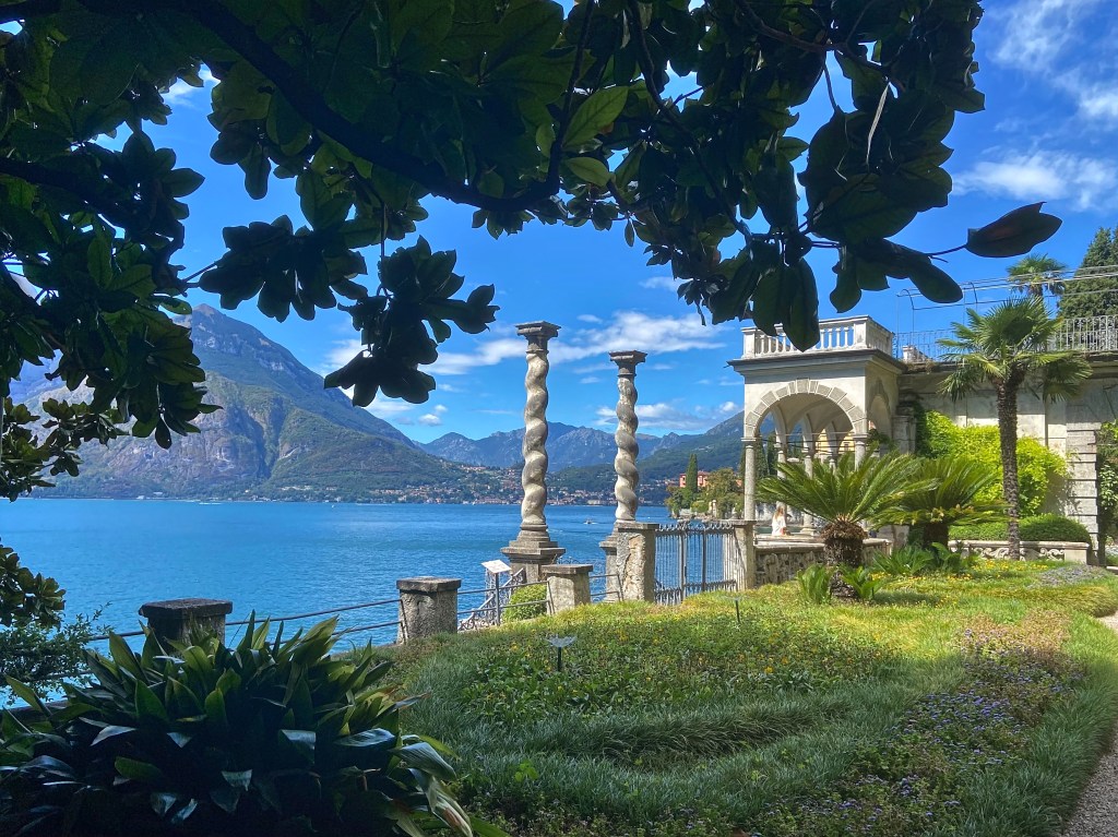 The first view of the gardens and the lake left us stunned! It was from just outside the ticket office and huge arched windows gave us this stunning view of sloping green mountains meeting the shimmering and glittering waters of Lake Como. We had purchased tickets only to the gardens and not to the villa. So we made our way down the brilliantly manicured gardens of the villa that offered unrivalled views of the lake from its terraces. It was hot and we were grateful to find shade along many parts of the garden to stop, sometimes sit and take in the views of the lake and the mountains.