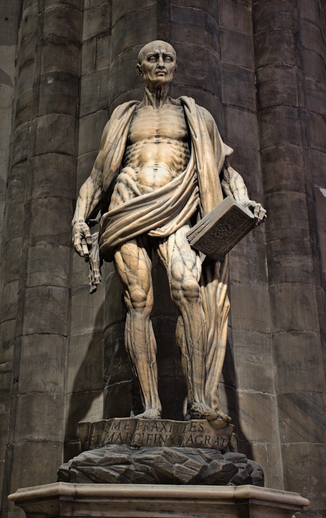 The cavernous interior of the cathedral offered cool respite from the scorching sun outside and we sat down to take all the different features. The stained glass windows to the various churches held our interest. The highlight was the statue of St. Bartholomew wearing his flayed skin on his shoulders like a tunic.