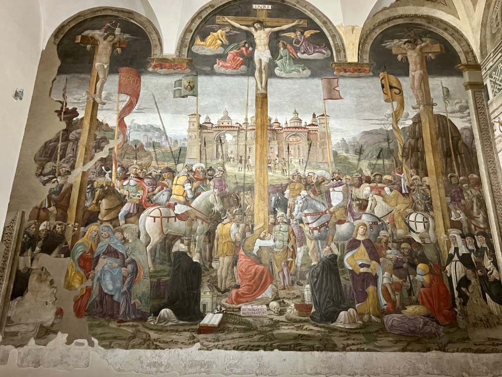 The refectory was dimly lit with most of the lights focused on The Last Supper and on the Crucification painting on the wall across. Everyone rushed to see the The Last Supper up close. The most striking feature about this fresco in spite of its faded colours is the faces of Jesus and his twelve apostles. Each one had a expression. Some were confused, some angry, some sad and in the midst of them all sat Christ, peacefully. Being one of Leonardo’s earlier paintings it was obvious why he evolved as a master with facial expressions.