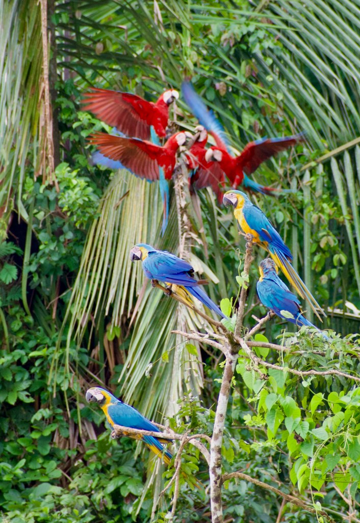 Freddy set up binoculars and tuned them so that we could spot the birds on the other side of the river. My furthest lens was at 300mm and I cranked it all the way to grab a few pictures. It was almost like a rehearsed event. The various species of parrots were on the clay lick, calling out to their mates between pecking at the clay. There were no macaws at the clay lick at that time but were up in the trees and tree hopping spreading their brightly coloured wings for us to marvel at. Soon the parrots flew out of the clay lick into the trees and the clay lick appeared empty. Due to their size and colour it wasn’t easy to spot them on the trees. Then a few macaws came down to the clay lick and started pecking on the clay. This time they had chosen another exposed part and Freddy had to readjust the binoculars to spot them. Then slowly more Macaws came down to the clay while the parrots flew away. And as the saying goes birds of a feather do flock together. There were three species of macaws at the same on the trees or the clay and they only grouped with the same species.