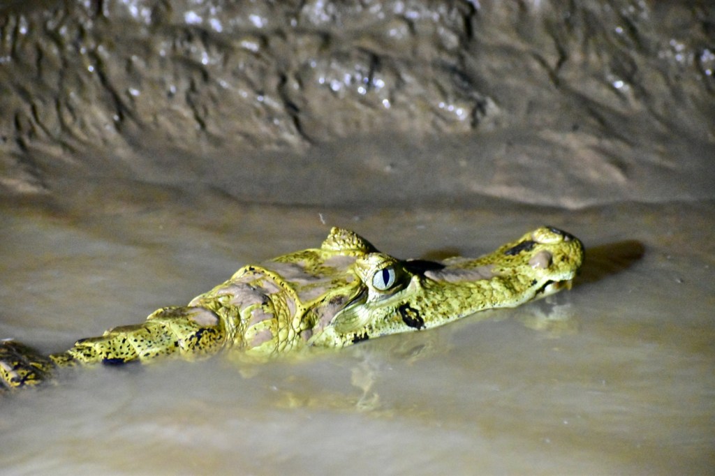 Sam cooled down after that sweaty afternoon walk and was ready to ride the boat for the cayman hunt. So we left around 7 pm when it was completely dark. Freddy switched on his flashlight and waved them at the banks every few minutes and turned them off again. We were wondering what he could see as it was complete darkness and he had his flashlight turned on only for a few minutes before turning them off. Soon he signalled to the boatman and we made a U turn to stop at the opposite bank. When he turned his flashlight on we saw a huge white Cayman right in front of us along the river. We marvelled looking at the cayman up close and were snapping away pictures. It got tired of us snapping pictures and wiggled away into the darkness. The boat started its return and Freddy spotted one more for us. It was quite close to the boat this time and Freddy tried to catch but it ran away. We spotted it holding its catch in its mouth.. most likely a piranha. Close to our lodge we spotted a black cayman. Apparently black caymans can be as long as 6 meters but they don’t like the noise of the river and prefer to stay in the oxbow lakes. The black cayman we saw was a small one. We realised Freddy spotted them by the reflection of the flashlight from their eyes!