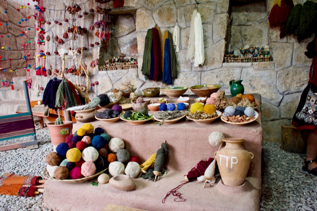 Located at 3800m or 12000 feet above sea level, Chinchero is known as the birthplace of the rainbow to the Incas. There’s a colonial church built on top of Incan ruins and a market in the town. Chinchero is also known for its weaving and Eddie recommended that we stop at a weaver’s cooperative for a demonstration and some shopping, if interested. It was a small coop with only women running it and one of the ladies demonstrated the different wools available and how they were treated before being spun into yarn and the natural pigments they used for colouring them. Baby Alpaca wool is considered the softest and the most expensive followed by adult alpaca wool. Acrylic was also sometimes mixed to make the garment cheaper. We decided to pick some adult alpaca scarves for me and Shash and grab a couple of pictures with the alpacas and llamas that were outside the coop. Apparently Alpacas do not like the water and their wool is always dirty!