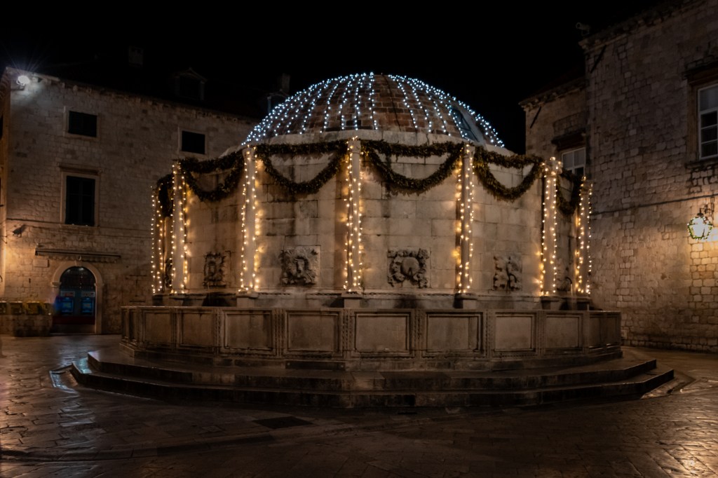 As we were dropped off near the Ploče Gate we were straight away charmed by this beautiful old town. It was the day after Christmas and there were a lot of people out and about. The streets were busy with diners, stalls and tourists. There was loud music playing and it appeared like a carnival was going on. However when we entered the side streets it all quietened down and we rolled our suitcase on the limestone streets towards our Air BnB.