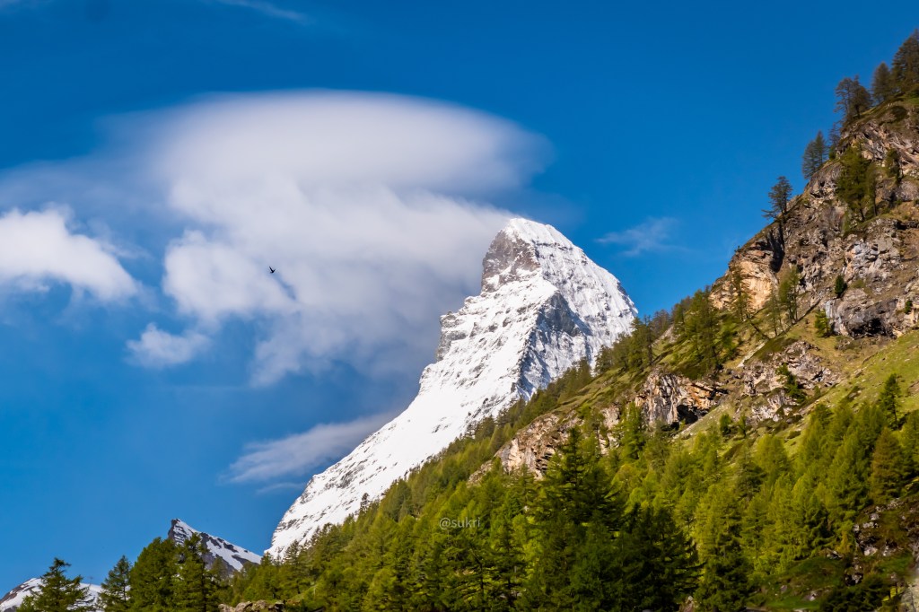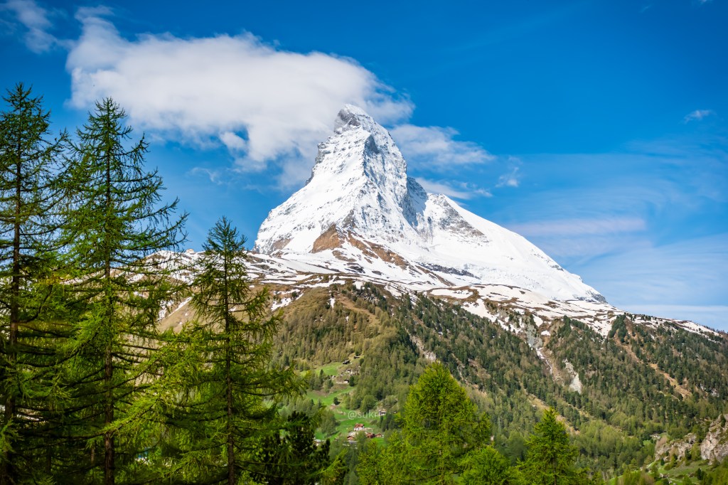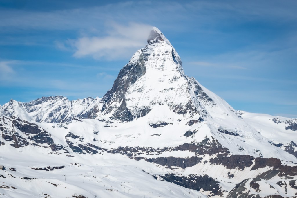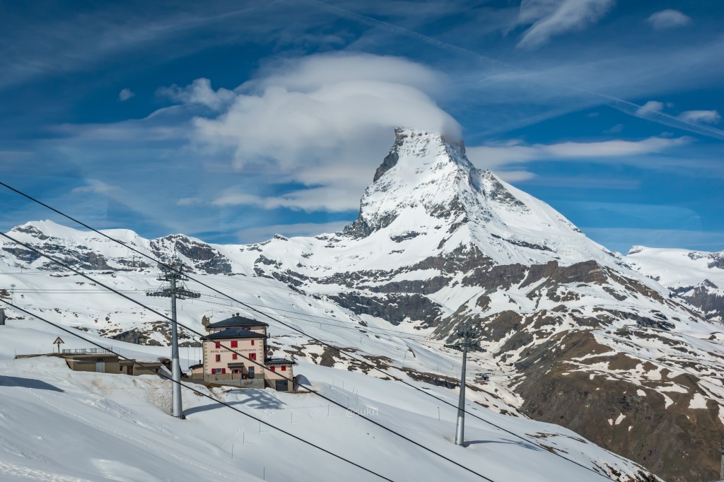 At 4478m Matterhorn is not even the tallest mountain in Switzerland but it is the most identifiable. It is on souvenirs, on trains and buses, on travel brochures and guides and even on chocolates! Toblerone had the Matterhorn on its logo until they moved their production to outside Switzerland. It would be a travesty not being able to see it after it being the face of Switzerland! It’s located on the border between Switzerland and Italy. Many attempts have been made to summit it. Despite it having a ridge and a gradual ascent from the Italian side, the mountaineers could not summit. The successful summit was made from the Swiss side in 1865. The Hörnli hut, perched on a ledge at the foot of the Matterhorn (a tiny spec in the picture above), is used for overnight stops in hikes to Matterhorn today. The hike to Hörnli mountain hut is a worthy hike in itself.