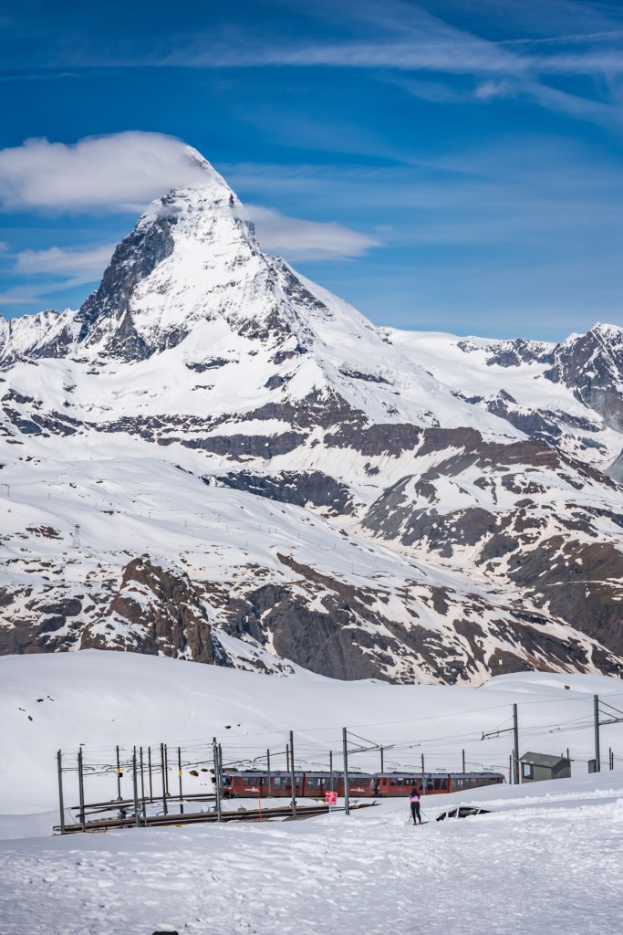 As the train makes its way up you’re rewarded with views of the Matterhorn with the the town of Zermatt spread out in the foreground. Slowly we leave the town behind and our views are replaced with mountains, Alp-pine trees and some snow. As we climb, we leave the greenery behind for pristine, white snow! All the while the Matterhorn refuses to leave our line of vision. We also see the valley to the north of Zermatt which is guarded by several 4000m peaks on either side.