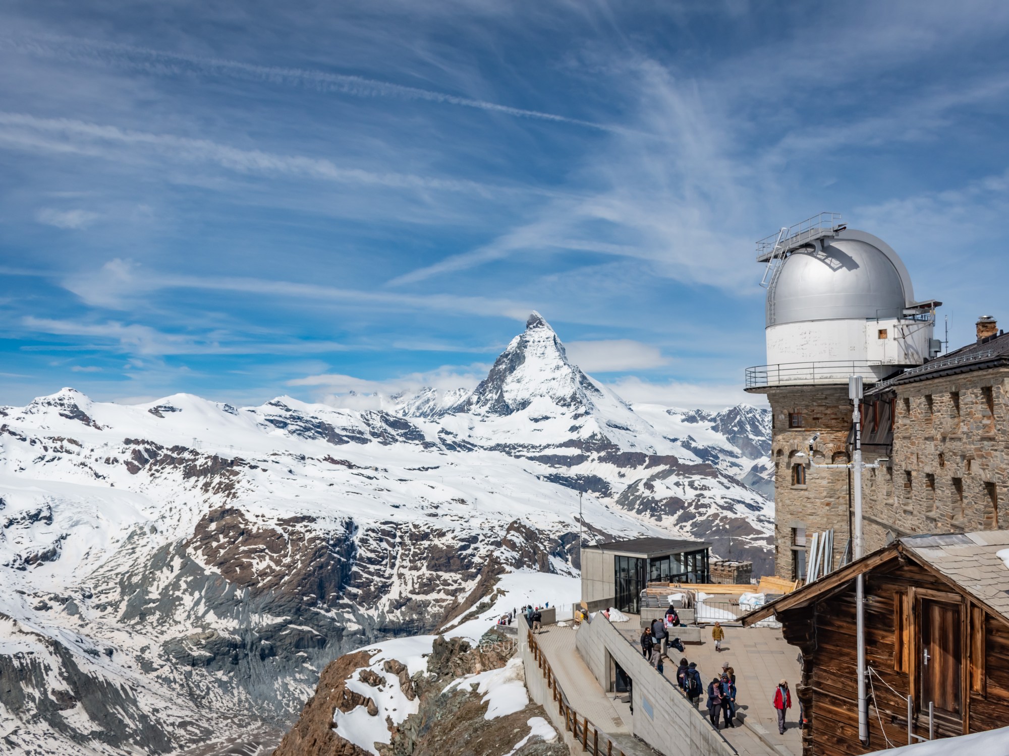 The Kulm Hotel is the highest hotel in the Swiss Alps. Rooms are available for overnight stays here. There is an observatory in the top floor of this hotel that is available exclusively for the hotel’s overnight guests and researchers. There is a restaurant and a terrace that is open to other guests. The view of the station and the Kulm Hotel with its observatory is a nice alternative to the snow clad peaks.