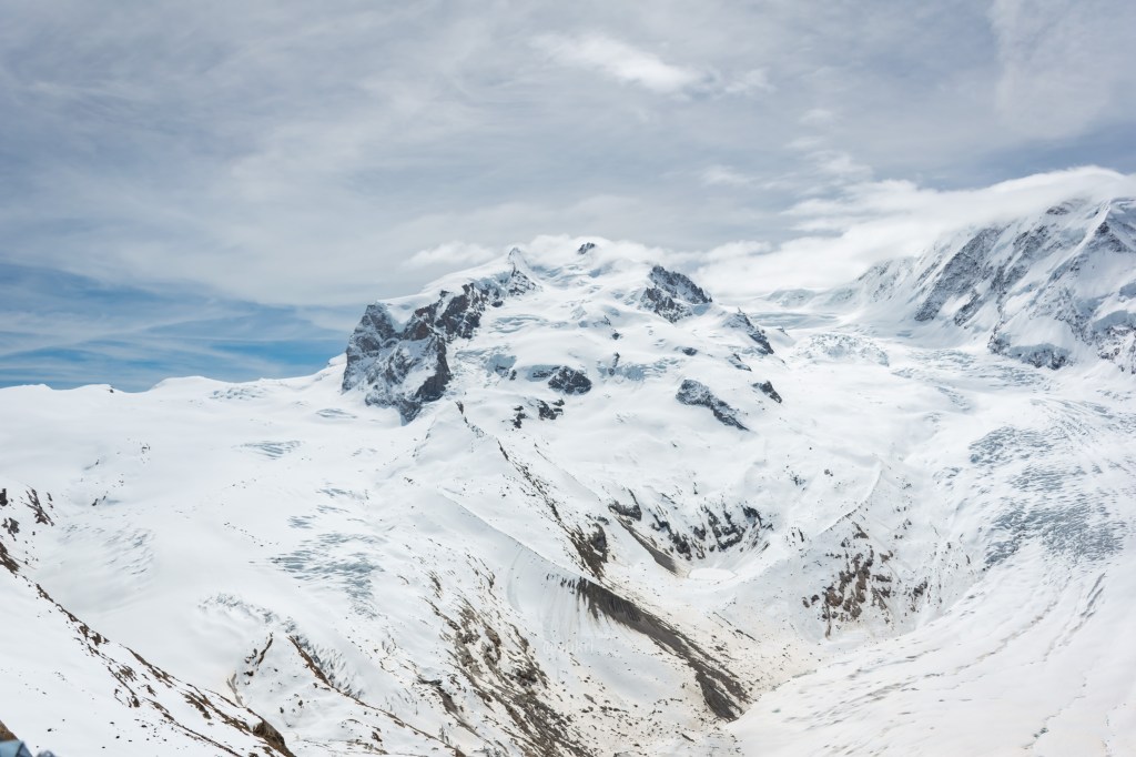 The Monte Rosa massif is the tallest mountain in Switzerland. It has two peaks – the Nordend, on the left and Dufourspitze (4634m) on the right. If you have a pair of binoculars or excellent zoom on your camera you can also see the futuristic looking Monte Rosa hut (the night stop for hikes to Monte Rosa). The glacier to the left of the mountain is the Gorner, which is right below your feet and the one to the right is Grenz.