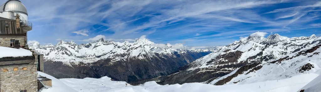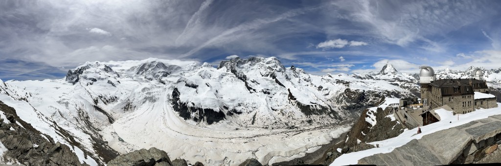 There are multiple mountain tops that vie for your attention and money in Switzerland. Jungfraujoch is the most popular, followed by Mount Titlis and Glacier 3000 that take you up expensive Gondolas/trains to the top of the highest peak in the area with the possibility of snow and also proximity to a glacier. The reason we chose Gornergrat was because it was one of the cheapest and with the most bang for your buck. The Alps near Zermatt have the majority of the tallest peaks. You can several 4000m+ peaks from Gornergrat including the Matterhorn in all its glory. You can also see about 8-10 glaciers located between these peaks. The Monte Rosa massif with its tallest peak, the Dufourspitze, which happens to be the tallest mountain of Switzerland at 4634m is right across the valley from Gornergrat. The Gorner glacier and the Grenz Glacier meet right below Gornergrat. Many Swiss believe this to be the best view in all of Switzerland.
