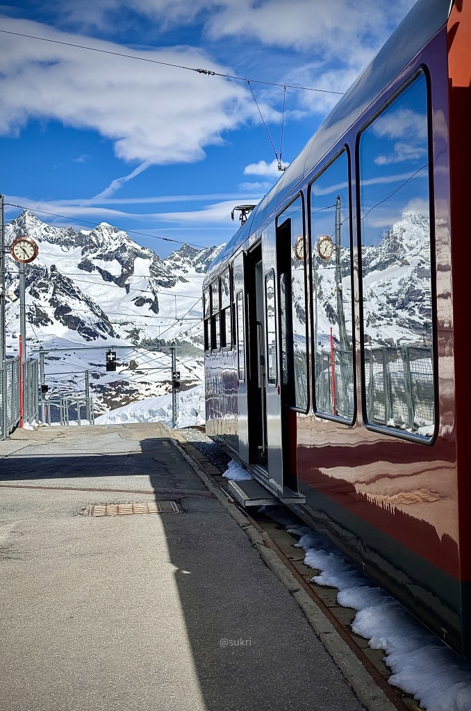 This is Europe’s highest Cog wheel train and operates 365 days a year since 1898. It is also the world’s first fully electrified cog railway. It travels from Zermatt at 1620m to Gornergrat at 3089m over 9.4 kms of cog wheel track and makes a vertical climb of 1469m. The scenery from the windows of the train are unparalleled. It is better to sit on the right side of the train going up. To do this, buying a priority boarding would be a good idea during the peak season. As we visited in the low season we did not purchase it but stood near the doorway before they opened so that we could rush to grab a seat on the right side.