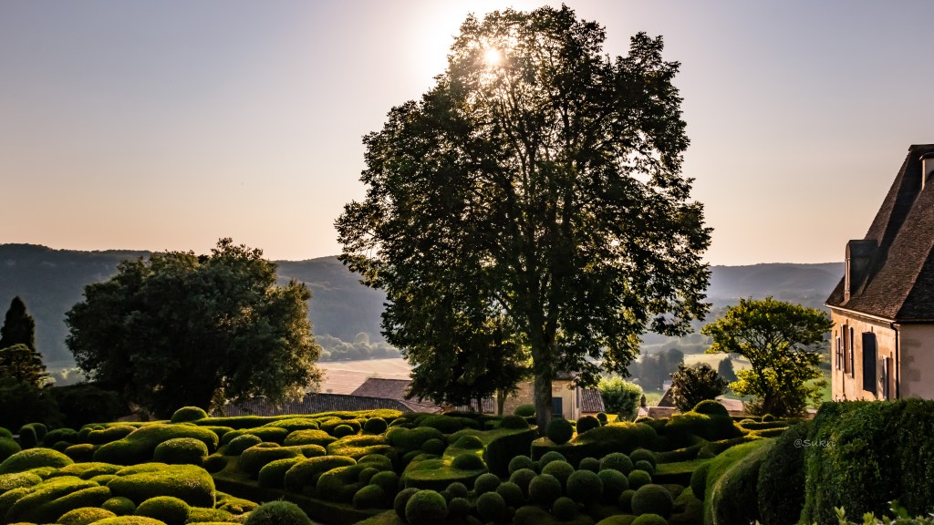 We visited the gardens at about 5 pm in the afternoon when the sun was casting its golden rays. Despite cooling off in the Dordogne river just a few minutes ago we were hot and sweaty so we headed straight to the cafe for a drink and a pastry. We caught the garden’s famous peacocks as they rested near the cafe, looking out to the valley.